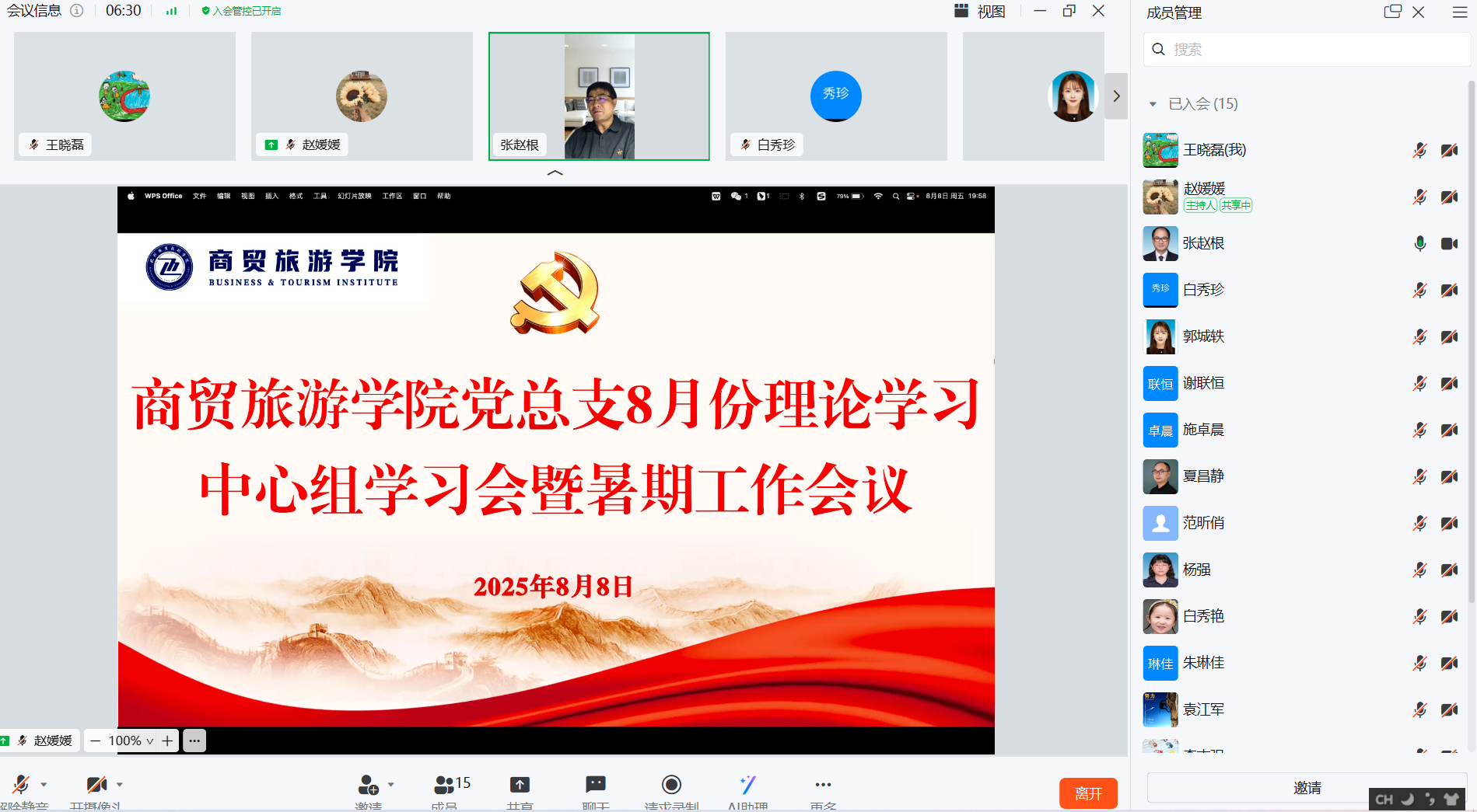 8月8日,商贸旅游学院党总支通过钉钉平台线上召开8月份党总支理论学习中心组学习会暨暑期工作会议。分院党总支委成员、党支部书记、中层干部参与学习研讨,会议由党总支书记、院长张赵根主持。
