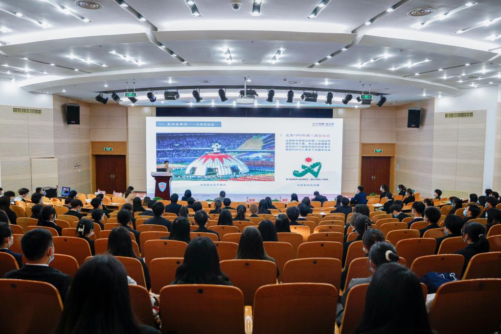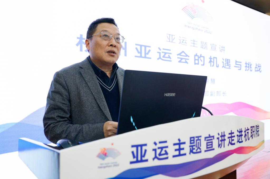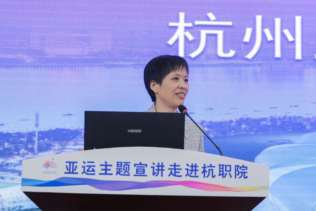 徐慧从历史、机遇、挑战三个维度对杭州亚运会展开介绍,同时也提及本次亚残运会的筹备工作。她以通俗易懂的方式、丰富有趣的语言,与在场师生共同回顾了亚运会的发展历史以及中国申办经历,详细介绍了杭州亚运会和亚残运会的赛事、标志物、会徽、吉祥物、核心图形、理念、目标等,鲜活解读了杭州亚运会在新时代面临的各类挑战,并从推动城市能级提升、推动经济发展、推动科技进步和推动文化繁荣等层面出发,生动阐述了举办亚运盛会为杭州城市发展所带来的机遇。徐慧对杭职院的“融”“善”办学理念和志愿服务工作表示高度肯定。她勉励同学们,要踊跃参与到杭州亚运会、亚残运会的赛事服务工作中去,携手助力杭州亚运会和亚残运会的举办。