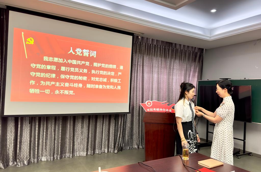 随后,沈音乐为毕业生党员代表佩戴党徽,全体师生重温入党誓词。党员们声音洪亮、激情澎湃,在铮铮誓言中重温入党初心,在入党誓言中强化党员身份认同,坚定理想信念。毕业生党员纷纷表示,此次主题教育专题党课是离校前一次重要的思想教育和精神洗礼,将时刻牢记党员身份,修身慎行,求真务实,做新时代担当作为的青年党员,为实现中华民族伟大复兴的中国梦贡献青春力量。