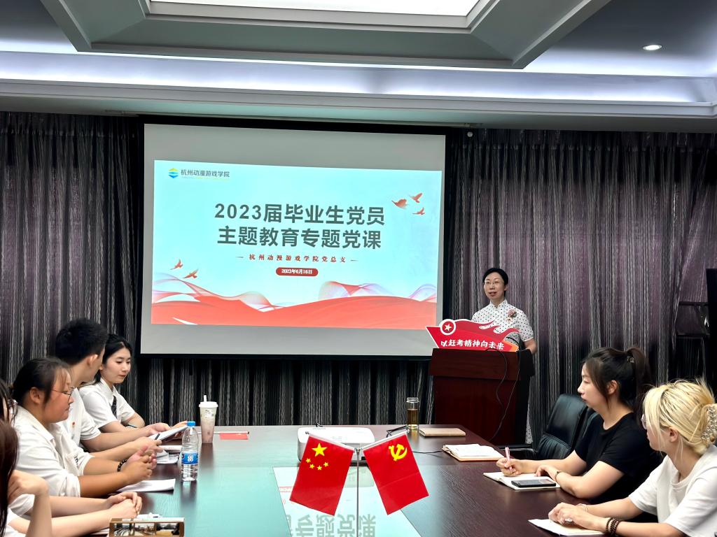 为持续深入开展学习贯彻习近平新时代中国特色社会主义思想主题教育,扎实做好2023届毕业生党员离校前的教育工作,6月16日下午,动漫游戏学院在307会议室举行“青春向党•信仰同行”2023届毕业生主题教育专题党课,动漫游戏学院党总支书记沈音乐、学生党支部书记杨叶青、党总支组织委员俞旭和全体毕业生党员齐聚一堂,共话新时代青年党员的责任与奉献、使命与担当。