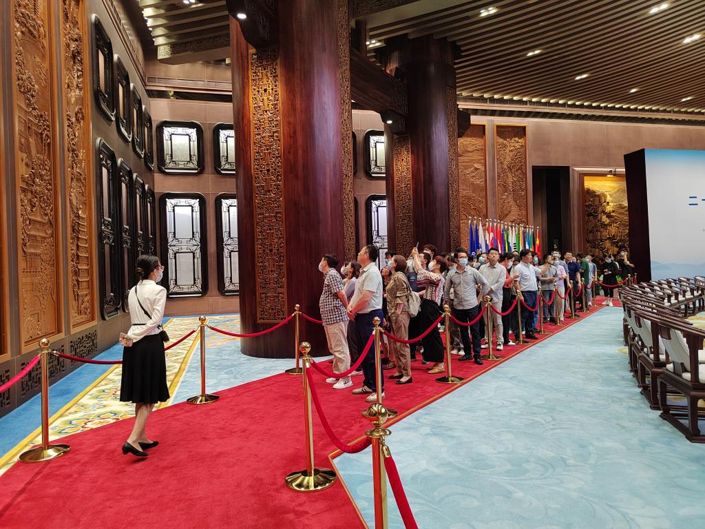 在专业讲解人员的带领下,大家先后参观了峰会迎宾区、接待厅、首脑合影区、峰会主会议厅、午宴区以及空中花园等地,亲身体验峰会现场氛围。磅礴大气的建筑布局、巧夺天工的木雕作品、浑然天成的印花墙体,毫无接缝的巨幅地毯,无处不彰显着泱泱大国的非凡气概,带给了参观者无比震撼的感受。整个会场建筑集庄重、现代、宏伟、绿色于一体,体现了“礼、合、仁”3个主题,让大家深刻感受到了大国风范和江南韵味。