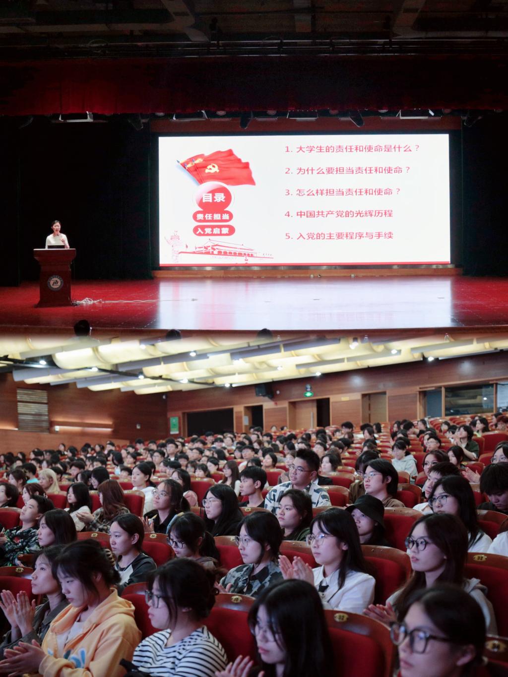 课上,沈音乐从“大学生的责任和使命是什么”、“为什么要担当责任和使命”、“怎么样担当责任和使命”、“中国共产党的光辉历程”、“入党的主要程序与手续”五个维度展开讲述,向同学们深入阐释了入党动机和入党初心两个重要内涵。在现场,沈书记鼓励同学们要把人生追求同国家和民族的前途命运联系起来,担当起属于自己那份责任,并努力奋斗,做胸怀“国之大者”、秉承“工匠精神”、担当“红色使命”的新时代好青年。