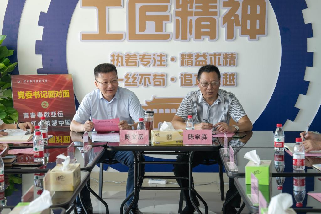 为全力做好亚运服务保障工作,持续推动主题教育走深走实,激励引导广大师生在服务保障亚运中打头阵、当先锋、作表率,9月19日上午,杭职院在锦晖苑A3楼三楼公共文化活动空间举行了“我和党委书记面对面”之“青春奉献亚运,红心筑梦中国”活动。校党委书记陈文岳、党委副书记陈泉淼,相关职能部门负责人,参与杭州亚运会、亚残运会的部分师生代表等一道参加。
