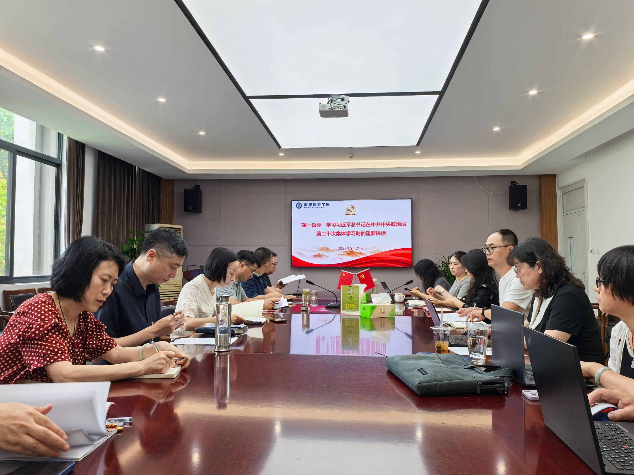 5月21日,商贸旅游学院召开5月份党总支理论学习中心组学习(扩大)会议。分院党总支委成员、各党支部书记、专业负责人、全体科级干部参加学习研讨,会议由党总支副书记范昕俏主持。