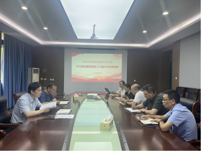 8月6日下午,吉利汽车学院党总支理论学习中心组在2409会议室召开专题学习会议,深入学习贯彻党的二十届三中全会精神。学院党总支书记邵立东、副书记张理剑及相关部门负责人参加了此次学习,会议由邵立东主持。