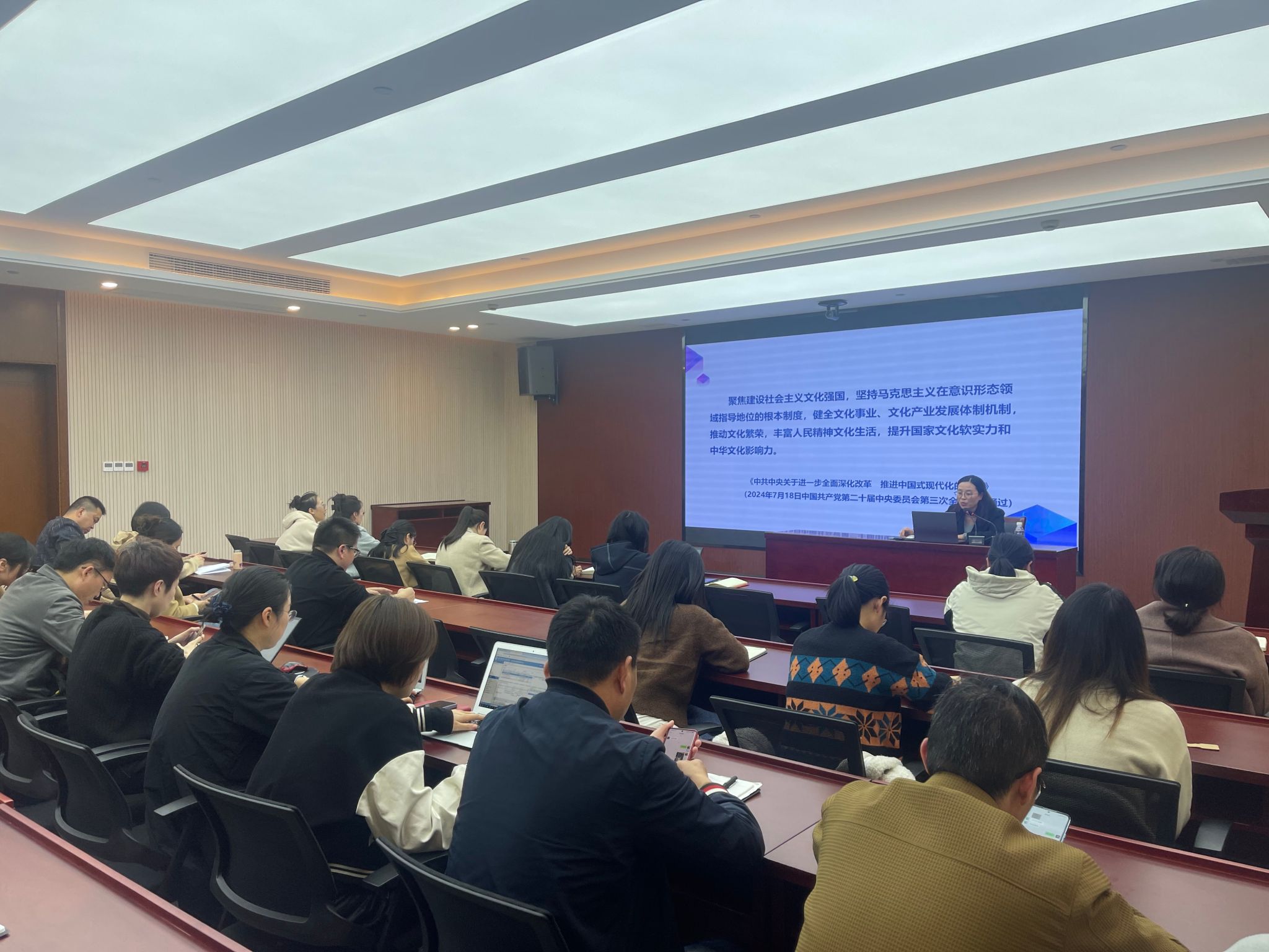 为深入学习贯彻党的二十届三中全会精神,进一步丰富机关理论学习形式,为机关干部提供学习交流的平台,拓宽视野,增长才干,11月22日下午,机关党委在行政楼121会议室举办主题学习沙龙活动,机关科级干部、机关菁英计划人员、各党支部委员、青年理论学习小组成员参加了活动,机关党委书记何霞红主持活动。