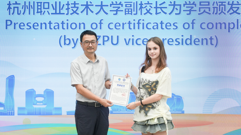 副校长楼晓春和德国莱比锡大学孔子学院执行院长Benjamin Creutzfeldt分别致辞。楼晓春表示,学员们既是科技的探索者,也是文化的传播者。希望他们当好文化的使者,用心传递真实、立体、全面的中国故事。Benjamin Creutzfeldt在线发来视频致辞,他欣喜地看到,德国的“双元制”职业教育模式在杭州职业技术大学得到了创造性的借鉴与发展,为年轻人铺设通往未来智能制造的职业道路。Isaak Kerstin老师代表德国莱比锡大学孔子学院及全体师生,向杭职大致以衷心感谢,感谢杭职大提供的宝贵学习机会。她表示,两周时间里,学生们不仅游览了诸多美景、提升了汉语水平,更深入领略了中国文化的魅力,收获满满。项目负责人刘博寄语学员们,通过中文这把“金钥匙”,插上语言的“翅膀”,开启探索中国和中华文明的大门。