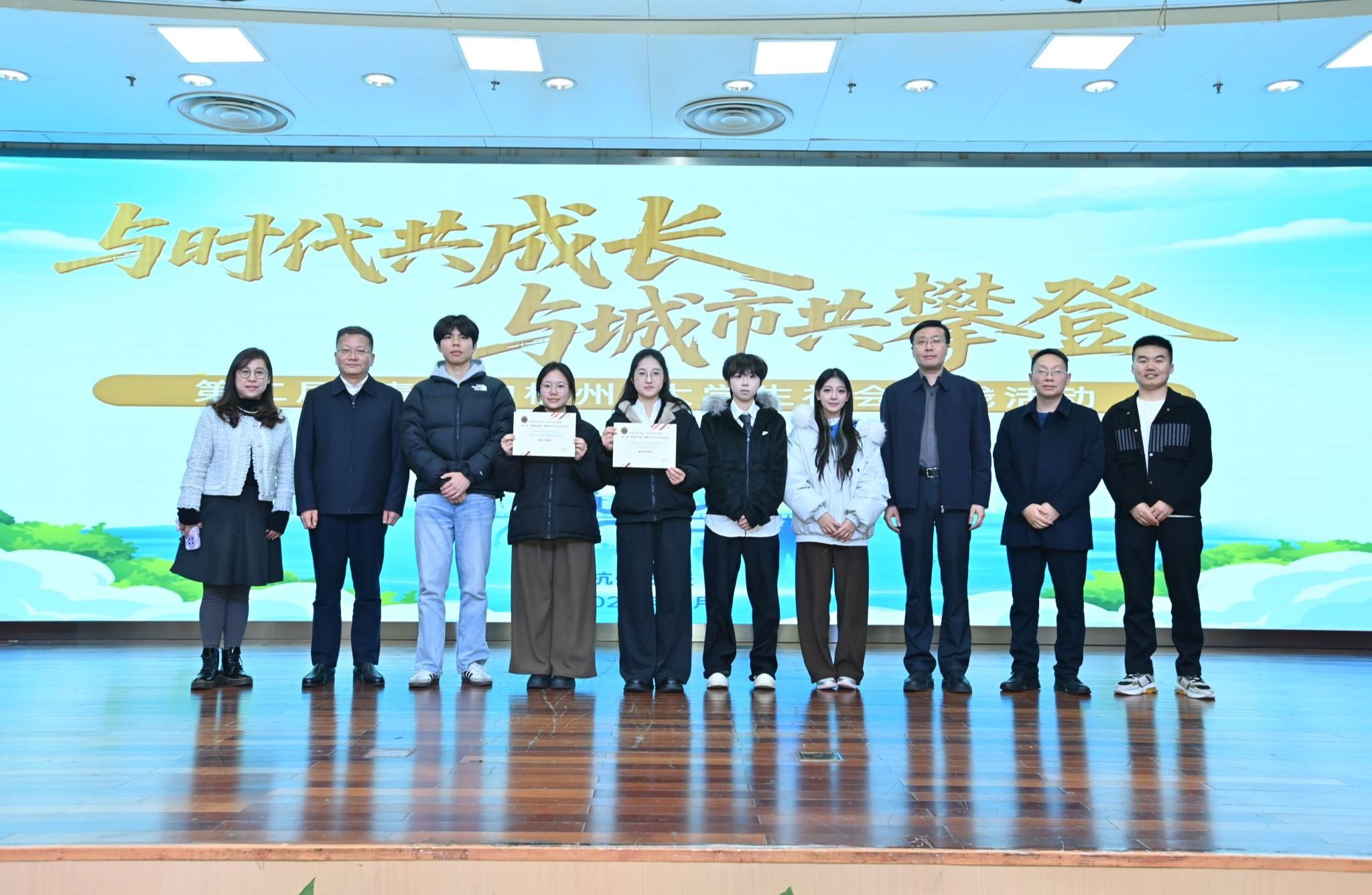 12月21日,“与时代共成长 与城市共攀登”第二届“青爱的杭州”大学生社会实践展示交流活动在杭州新闻大厦顺利举办。杭州市委宣传部、杭州市教育局、共青团杭州市委、杭州日报报业集团领导出席并颁奖,杭州职业技术大学党委书记陈文岳颁奖并寄语,党委副书记赖明诚出席并颁奖。