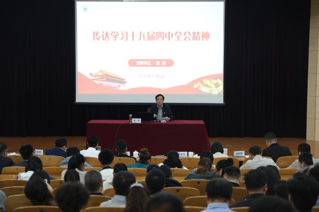 会上,金波传达了十九届四中全会精神。他指出,党的十九届四中全会是在新中国成立70周年之际、“两个一百年”奋斗目标的历史交汇点上,召开的一次具有开创性、里程碑意义的重要会议。全会审议通过的《中共中央关于坚持和完善中国特色社会主义制度、推进国家治理体系和治理能力现代化若干重大问题的决定》,对坚持和完善中国特色社会主义制度、推进国家治理体系和治理能力现代化作出了全面部署,是指导全党、全国人民推进新时代中国特色社会主义伟大事业的纲领性文件。