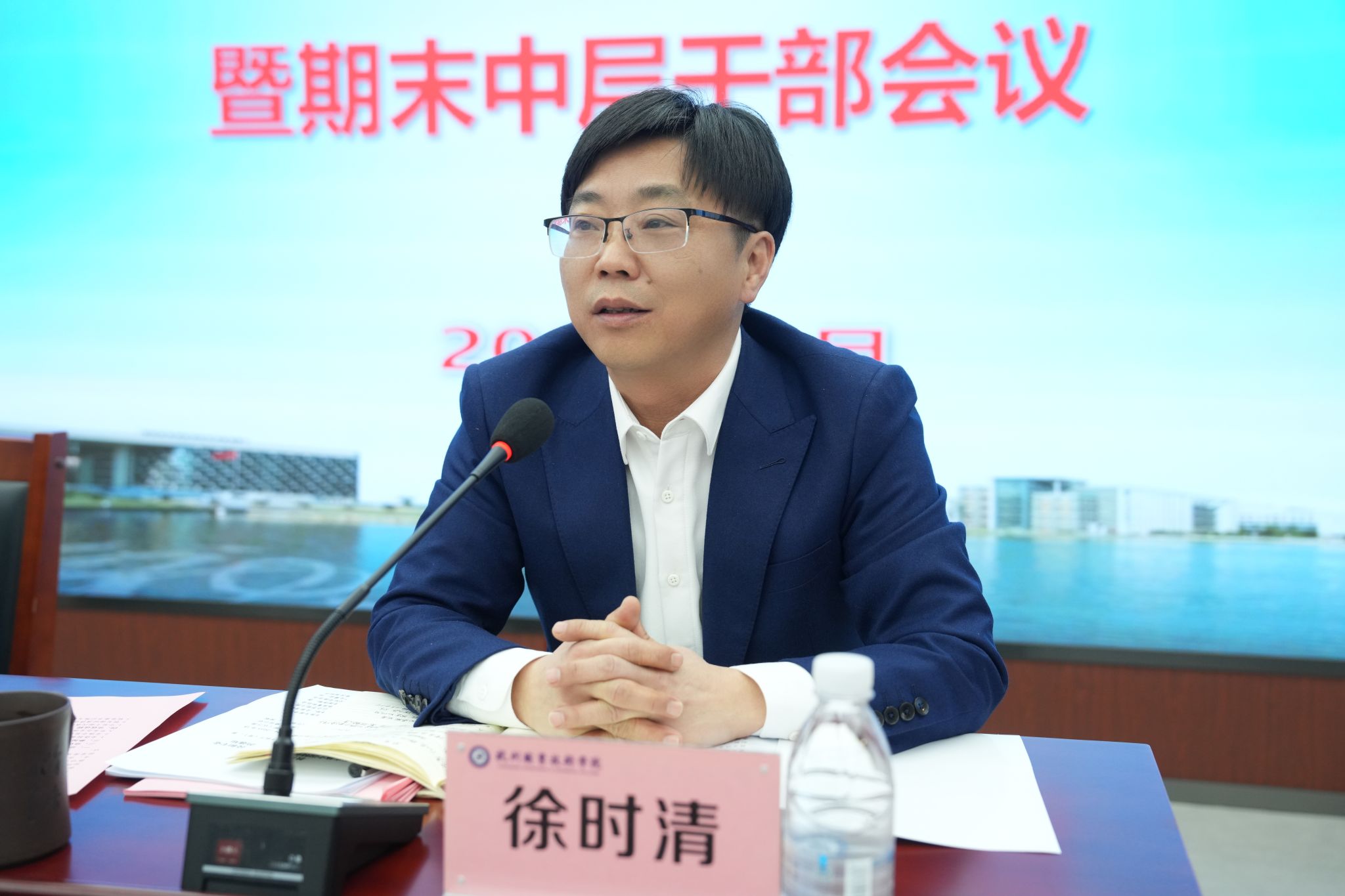 校长徐时清在讲话中对学校过去一年取得的重大标志性成果业绩作了简要回顾,感谢广大干部和师生一年来的辛勤付出。他从学理性和实践性相结合视角,分享了他对职业教育、大学之道、大学功能、职业本科教育的发展历程的研究思考,阐述了他对职业本科、应用型本科、普通本科之间的“异与同”学习思考。他指出,要加强职业本科教育的理论研究和实践探索,积极探索学校的职业本科教育特色发展之路。他强调,广大干部要讲政治、顾大局、树标杆、有担当、守底线,将工作落实在高素质技术技能人才、大国工匠、能工巧匠的培养过程中,着力为职业教育高质量发展贡献“杭职力量”。