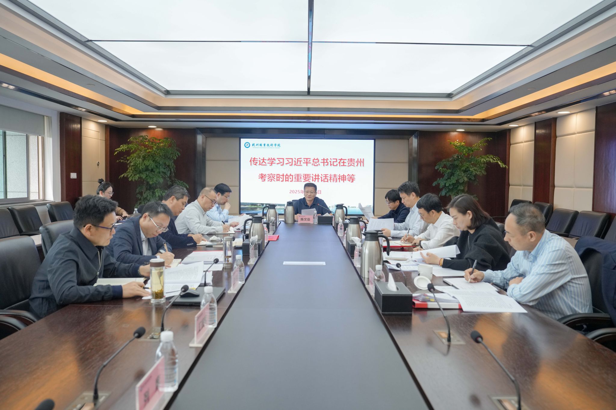 3月27日上午,学校在528会议室召开党委会“第一议题”学习会,深入传达学习习近平总书记在贵州考察时的重要讲话精神、关于深入贯彻中央八项规定精神学习教育的重要指示精神和在《求是》杂志发表的文章《坚持和落实“两个毫不动摇”》。校党委书记陈文岳主持会议并讲话。