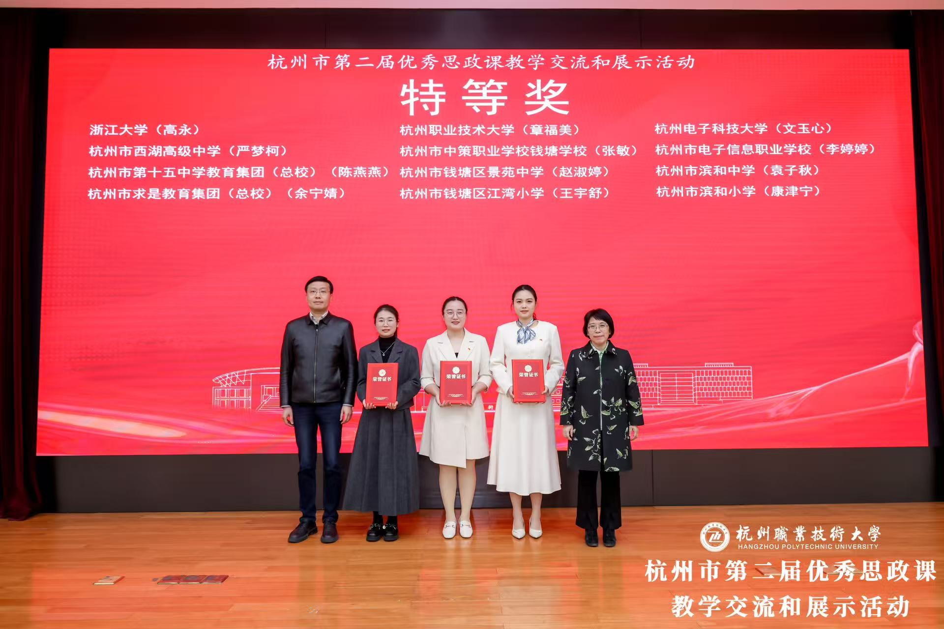 会上颁发了优秀思政课教学比选的特等奖、一等奖、二等奖及优秀组织奖。杭州电子科技大学、杭州职业技术大学、浙江大学牵头的3个团队荣获特等奖。浙江商业职业技术学院、浙江育英职业技术学院、国科大杭州高等研究院、杭州师范大学、浙江金融职业学院牵头的5个团队荣获一等奖。会上,特等奖和一等奖团队现场展示了创新推进大中小学思政课一体化改革的教学设计成果。