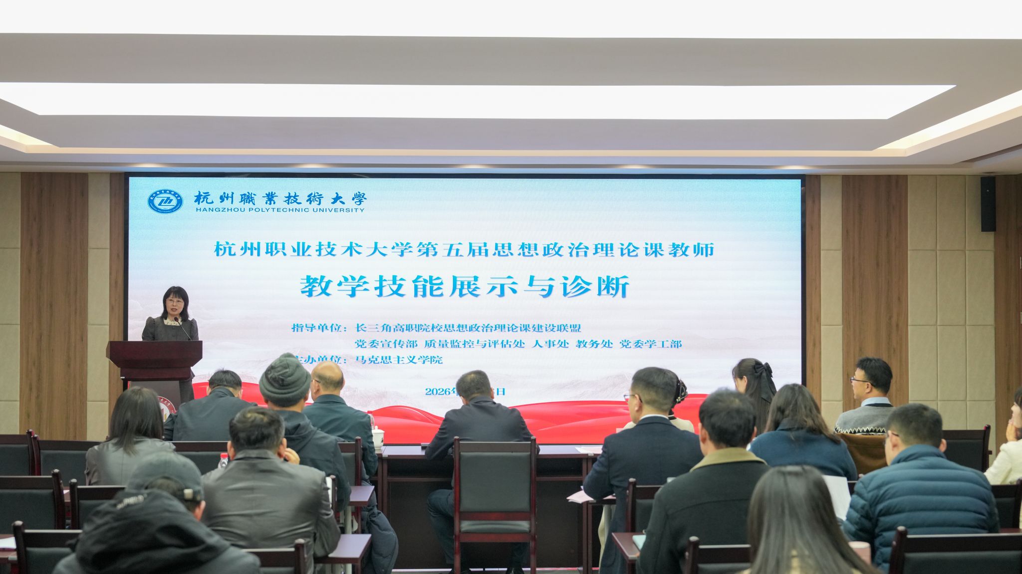 1月16日下午,学校第五届思想政治理论课教师教学技能展示与诊断活动在明德讲堂举行。活动由长三角高职高专思政课建设联盟、学校党委宣传部、质量监控与评估处、人事处、教务处、党委学工部联合指导,马克思主义学院主办。学校党委书记陈文岳出席活动并讲话,质评处处长戴凤微、教务处副处长许普乐和特邀嘉宾上海出版印刷高等专科学校马克思主义学院院长马前锋、上海东海职业技术学院思政课教师梁艺馨担任评委,全体思政课教师参加活动并现场观摩。活动由马克思主义学院党总支书记、院长邹宏秋主持。