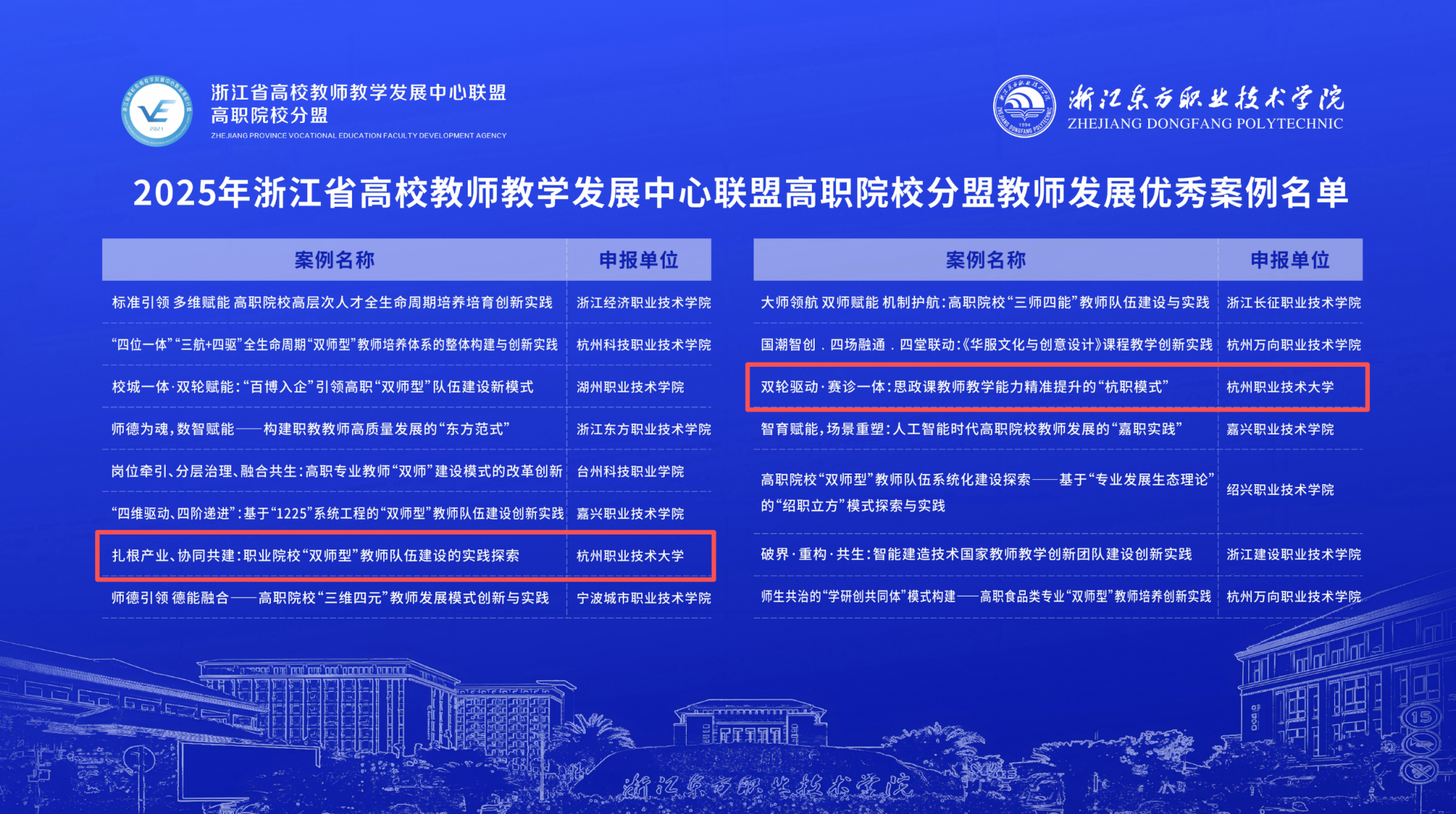 本次入选的2个省级优秀案例,集中展示了学校在教师教学发展机制创新、培训模式优化及数字化赋能等方面的实践成果,具有较强的示范性和推广价值,进一步提升了“杭职教发”的省内影响力。