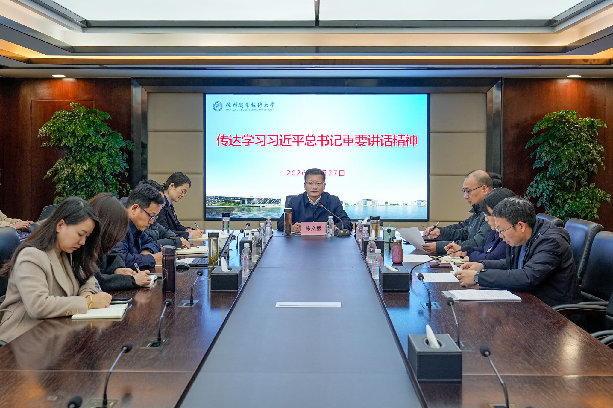 2月27日下午,学校举行党委会“第一议题”学习会,专题学习习近平总书记在中共中央政治局第二十四次集体学习时的重要讲话精神、《求是》杂志发表的重要文章《当前经济工作的重点任务》和在二〇二六年春节团拜会上的讲话等内容,研究学校贯彻落实相关举措。校党委书记陈文岳主持会议并讲话,校领导班子成员参加。